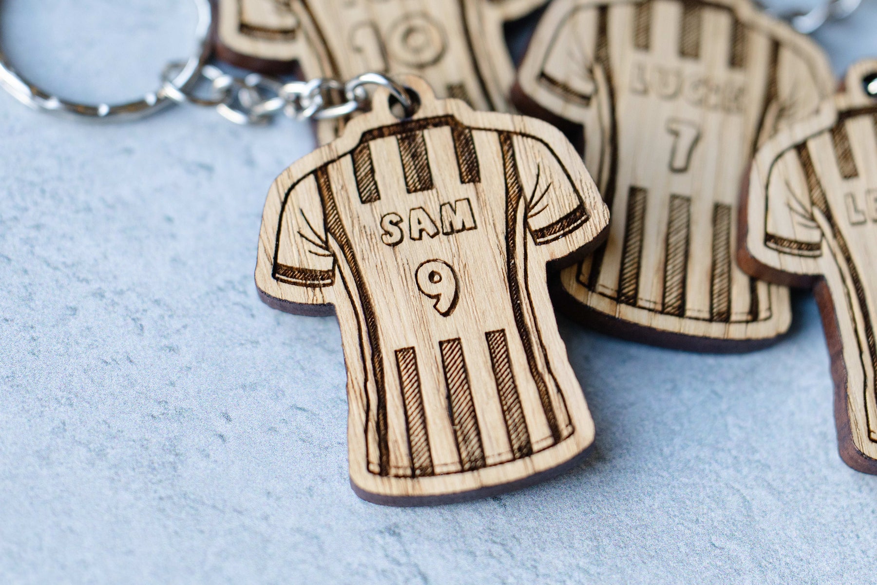 Crafted from wood and laser engraved for sharp detail, each shirt measures around 50mm and comes with a strong 1.2mm metal keychain that’s built for everyday use. They’re lightweight, durable and perfect for school bags, pencil cases or keys.