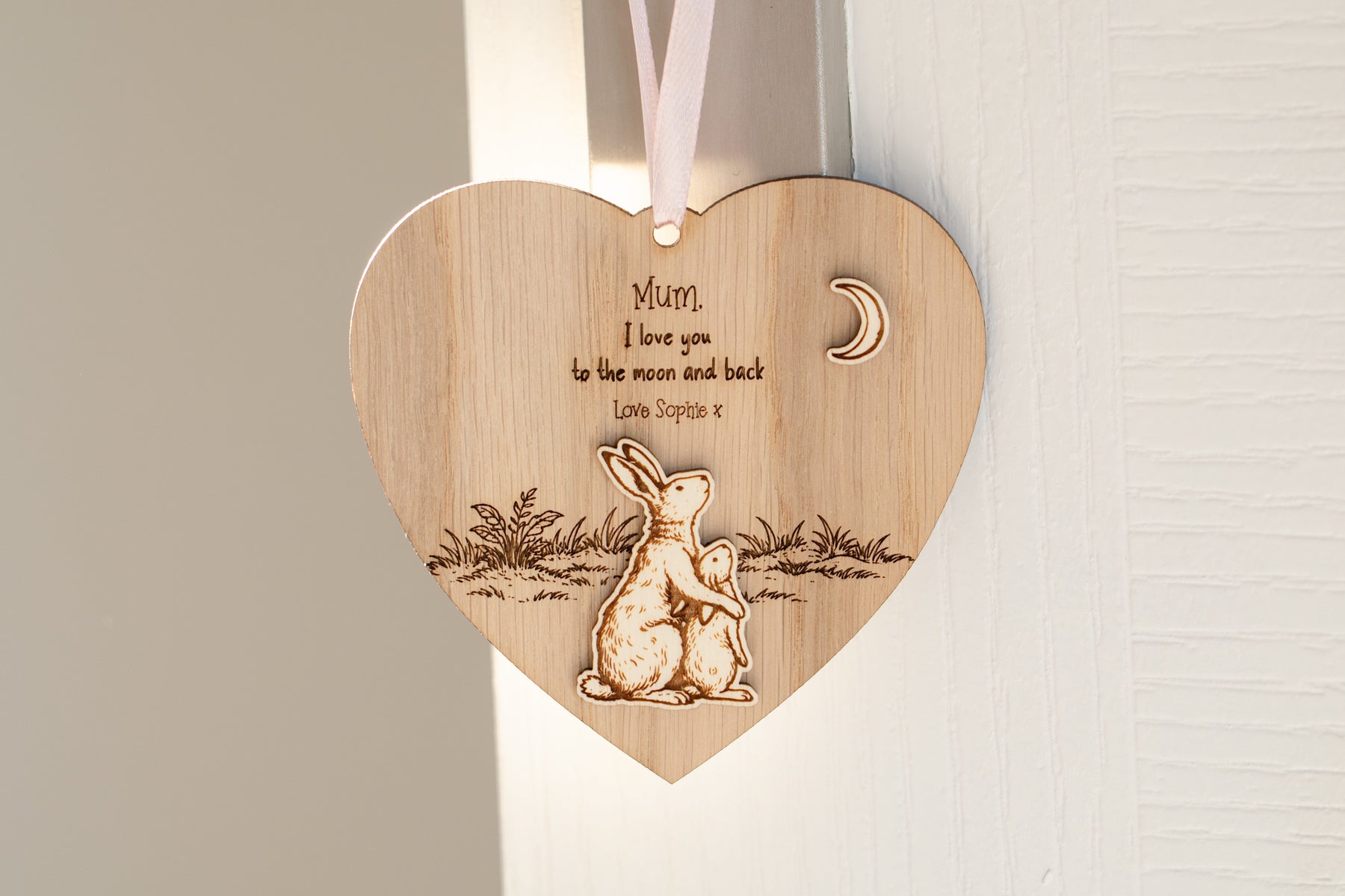 Our personalised wooden hanging plaque is engraved with the timeless phrase “I love you to the moon and back” — a message that never goes out of style.